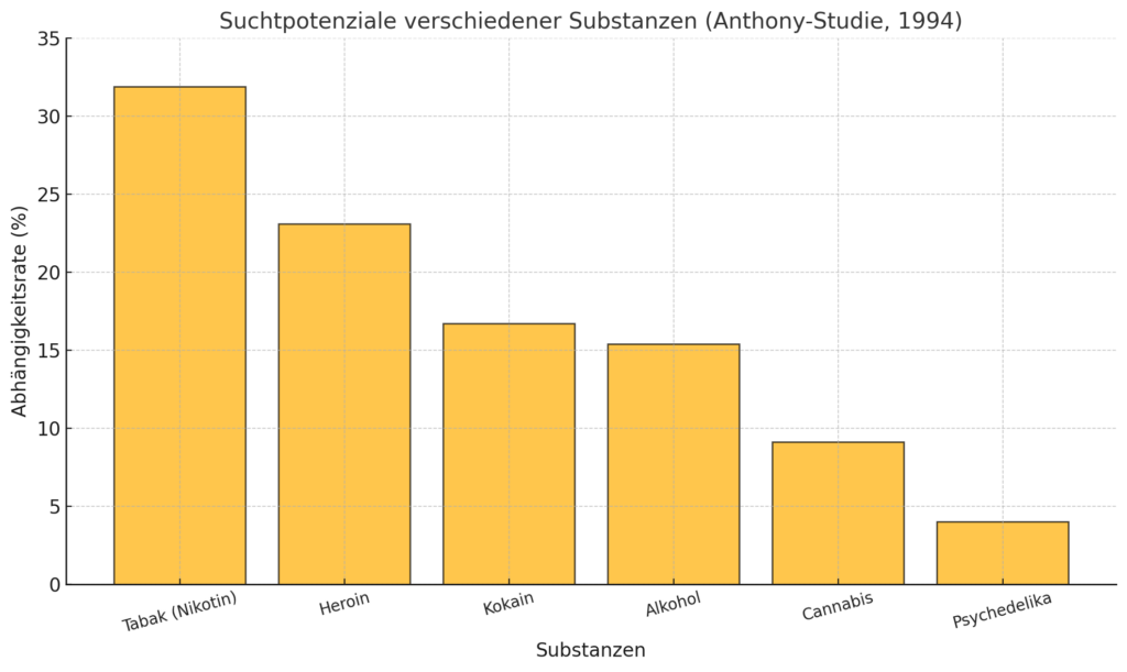 Neben der Gefährlichkeit von Drogen nach Dosierung, ist jedoch auch das Suchtpotenzial entscheidend. Hier zeigt sich dass Tabak (Nikotin) und Heroin zu den Substanzen gehören, die am süchtigsten machen. Laut einer Studie von James C. Anthony (1994) entwickeln 31,9 % der Erstkonsumenten von Tabak eine Abhängigkeit, während bei Heroin 23,1 % eine Sucht entwickeln – fast jeder vierte Konsument. Kokain folgt mit einem Abhängigkeitsrisiko von 16,7 %, was ebenfalls ein hohes Suchtpotenzial darstellt. Bei Alkohol beträgt die Wahrscheinlichkeit abhängig zu werden, 15,4 %, während es bei Cannabis nur 9,1 % sind – weniger als jeder zehnte Konsument entwickelt eine Abhängigkeit. Damit wird deutlich, dass Cannabis ein moderateres Suchtpotenzial hat als sowohl Alkohol, als auch die meisten illegalen Substanzen.